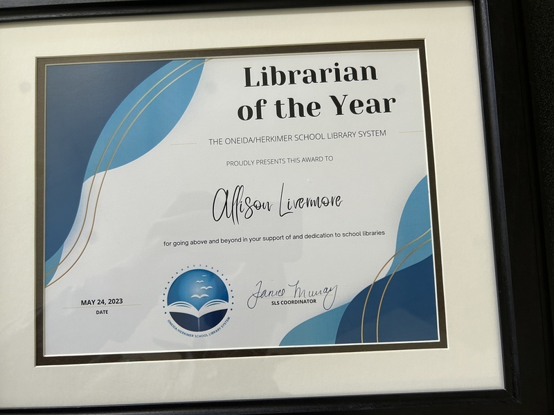 On May 24, 2023, Allison Livermore was awarded Librarian of the Year for Oneida-Herkimer-Madison BOCES.