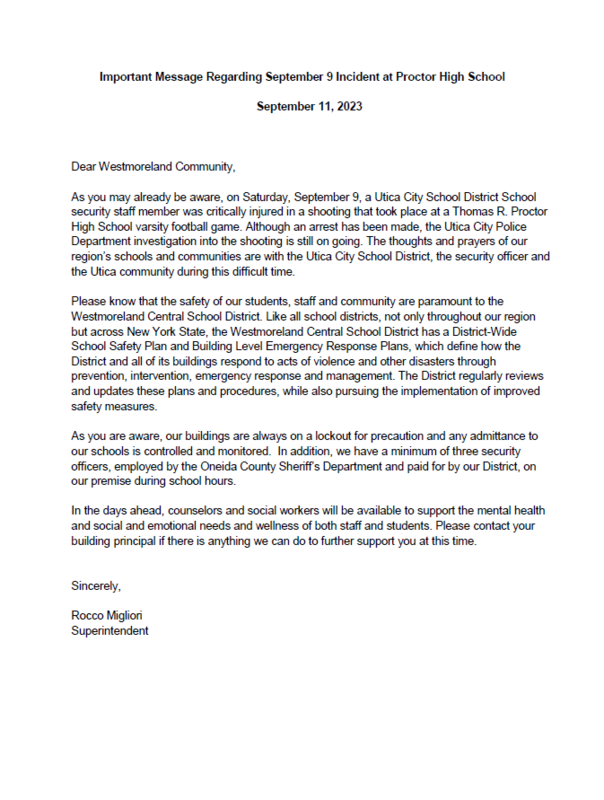 Important Message Regarding 9/9/23 Incident at Proctor High School